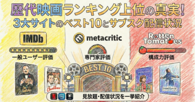 各サイトの評価基準の違いが最も顕著に表れる、歴代ランキングの上位10作品を一覧表にまとめました。掲載作品を観たいという皆様のお気持ちに応えるため、主要なVODサービスでの配信状況(見放題、またはレンタル)も記載しております。各サイトの最新ランキングへアクセスできるURLも明記しましたので、あわせてご活用ください。